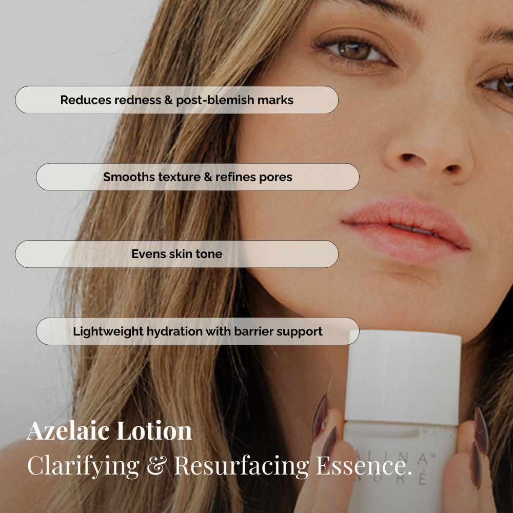 Unlike traditional exfoliating acids that primarily resurface the skin, azelaic acid supports tone correction, visible redness reduction, and clarity while remaining gentle and well-tolerated. It refines without aggressively stripping the skin barrier.